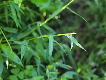 ![]() ササのような葉とつるっとした細い茎が特徴です。 茎は黄緑色ですが、下部は赤みを帯びます。 |