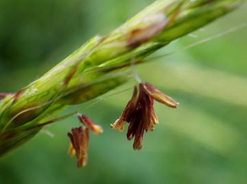 ![]() 5oほどの小穂に長さ10oほどの芒がついています。赤茶色の雄しべの葯(やく)がぶら下がっています。 |