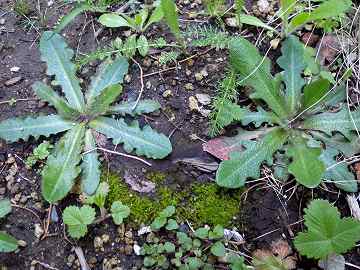 ![]() 春はロゼット状根生葉。畑では通路など固い所で見かけます。 葉はヘラ形で、ほとんどの葉に鈍い切込みがあります。 |