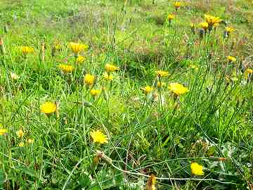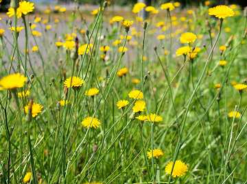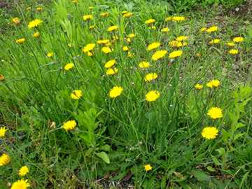 花はタンポポに似ていますが、1〜3本に分かれた長い花茎に花をつけるので、一目で識別できます。 葉はロゼット状に根生し、中心から花茎を伸ばして、黄色い舌状花が集まった直径3〜4pの頭花を咲かせます。 名前の由来は、この花の俗名がフランス語で「Salade de porc」、直訳すると「 豚のサラダ」で、そのまま命名されたとのこと。 私の畑の中では通路に少しあるぐらいですが、土手や草地で一面に群生している様子はとてもきれいです。 | ||