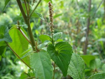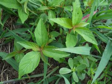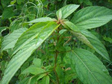 道端や畑に生える1年草で高さ30〜70cm、茎はよく枝分かれします。 互生する葉は長楕円形で、先は尖り鈍い鋸歯があります。 葉腋から花序出し、上部に小さな赤褐色の雄花が穂状に、基部には卵形の苞葉に抱かれた雌花がつきます。 畑では畝の中によく生えていて、引き抜くと強くて長い根がそのままついてきます。 名前の由来は、葉が樹木のエノキの葉に似ているから。 別名のアミガサソウは、花序の基部にある苞葉が編み笠に似ているからとも。 |