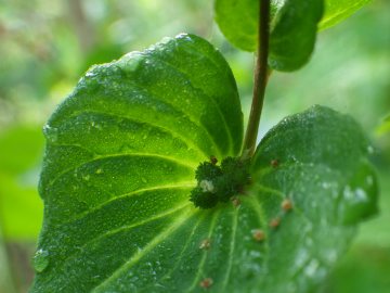 ![]() 葉腋から出た花序。上部に穂状の雄花、基部に苞葉に抱かれた玉のような3つに分かれた子房が。 |