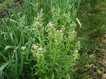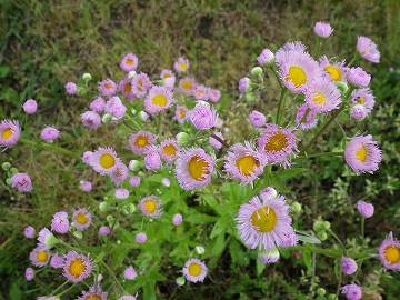 大正時代に鉢植えから広がった北アメリカ原産の帰化植物。繁殖力が強く、今や畑や道ばたに普通に見られます。 へら状の根生葉からなるロゼットは、草の少ない春によく目を引きます。 つぼみはおじぎをするように垂れ、開花すると上を向きます。花の直径は、2〜2.5p。 名前は、春に咲く紫苑なのでハルジオンですが、実際は9月末頃まで元気に咲いています。 私の畑の中では通路に少しあるぐらいですが、土手や草地で一面に群生している様子はとてもきれいです。 |
