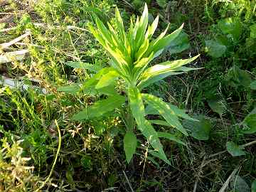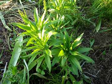 ロゼットで冬を越し、春に茎をまっすぐ立ち上げ生育を開始します。 根生葉は長楕円形、茎葉は10pほどの細長い形をしていて密に互生します。 高さは2m近くなり、畑で一番大きな草です。茎の上部は枝分かれし小さな花を円錐状につけます。 茎をつかんで引き抜けますので除草は簡単。引き抜いたものはネギの土寄せ代わりなどに使っています。 よく似たのに、オオアレチノギク(Conyza sumatrensis )があります。 |
