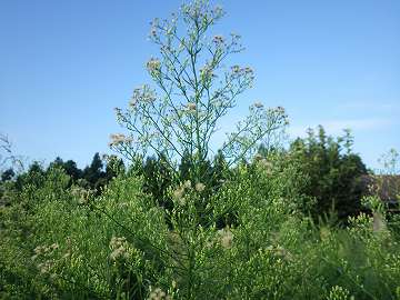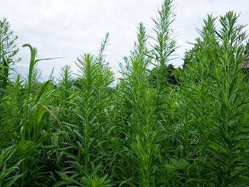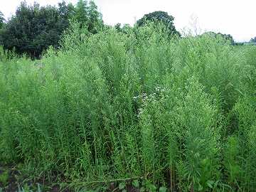 ![]() 隣の休耕畑では高さは150〜180p、2mを越しているのもあります。多くの草は、土手や道ばたより畑の方がたくましく大きいです。肥料分が多いせいでしょう。 |