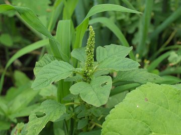 高さは20~40㎝くらい、葉は互生する単葉で菱状卵形の全縁、先端がへこんでいます。 葉の付け根や茎先に、緑色の粒が密に多数集まった花穂をつけます。 花穂には雄花と雌花が混じってつき、果実は緑色のままです。 柔らかい茎先や若葉、地下の鱗茎は食べられるそうですが、食べたことがありません。 畑の中で見ることがありますが、数は少ないです。 名前の由来は、「イヌ」は犬、否(いな)で、役に立たないヒユの意、とのこと。 |