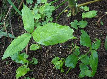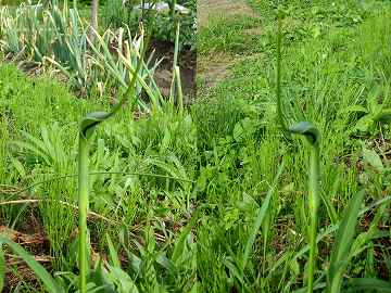 畑の草としてよく目にするサトイモ科の多年草、一度根付くと春になると必ず生えてきます。 繁殖力が強く、球茎につく子球、葉柄につく球芽(ムカゴ)、そして種子でも増えます。 春に、地下の球茎から長い葉柄を出して、3枚葉か1枚葉をつけます。 花は球茎から伸びた花茎の先に、初夏から夏にかけて咲きます。 花は仏炎苞に包まれた肉穂花序で、その上に付属体がカーブを描き鞭のように伸びる独特の姿をしています。 仏炎苞の長さは6pぐらい、苞の中に1本の肉質の花軸があって、苞の下部は雌花、上部は雄花が密生しています。 球茎は1〜2pほど、漢方で半夏(はんげ)と呼び、薬用にするそうです。効能は、消化,鎮吐,鎮咳、去痰等。 名前の由来は、仏炎苞をカラスの柄杓に見立て、半夏(ハンゲ)は夏半ばに花をつけるからとか。 私の畑では数が多いですが、種まきや苗植えの時に取り除くぐらいで、野菜作りにはほとんど影響ありません。 |