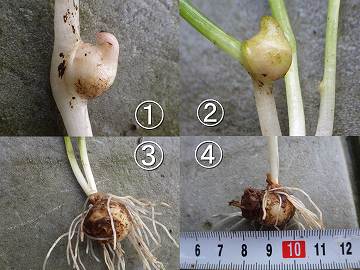 ![]() @は葉柄地面下のムカゴ、Aは地上のムカゴ。 (ムカゴは葉柄につき、花茎にはつかない) BとCは球茎で、これから1〜3本の茎が伸びます。 Cは、左は古く、右は子球が大きくなった新しい球茎。 |