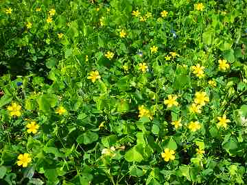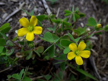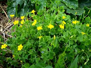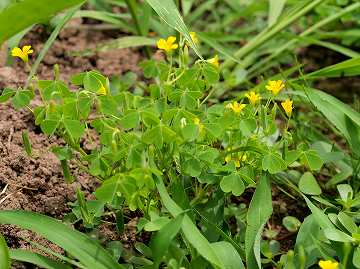 畑の畝の中にも生えています。茎は枝分かれし這い、上部は立ち上がります。 花は黄色の5弁花で、大きさは1pほど。果実は円柱形で、熟すと種をはじき飛ばします。 葉はハート形の三つ葉、日が当たると開き日が陰ると閉じます。 名前の由来は、閉じた葉が半分食べられたように見えるから片喰(傍食)とか。 私の畑の中では畝の中や通路の所々ありますが、野菜に邪魔にならない限りそのままにしています。 |