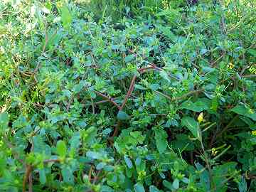 ![]() 茎は帯赤紫で斜上し、葉は互生で長さは15~25㎜ほど。 |