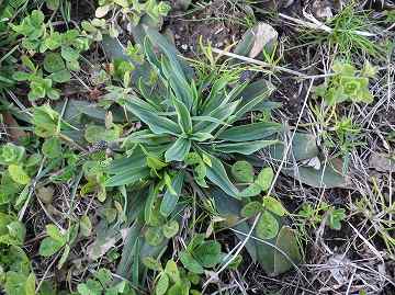 ![]() 春の根生葉、平行脈が目立ちます。よく見ると、つぼみが4つ。花茎がだんだん伸びて、5月中旬頃から花を付けます。 |