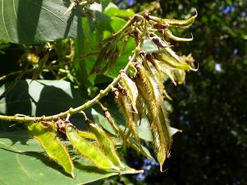![]() 花後の果実。鞘の中で徐々に豆が大きくなります。 豆は4〜5oのまだら模様が入った灰色です。 |