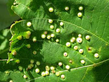![]() クズの葉にできたクズトガリタマバエの虫えい、クズハトガリタマフシ。大きさは3〜4oで中心部がとがっています。この中にクズトガリタマバエの幼虫が1匹ずつ入っています。幼虫越冬、蛹になって5〜6月に羽化。 |