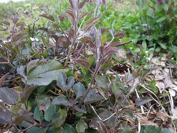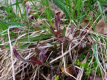 ![]() 畑の土手の小群落、芽が出始めました。 茎葉に、白い産毛が生えています。 |