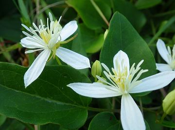 つる性の多年草で、お盆が過ぎるころから白い花をまといます。きれいですが、キンポウゲ科の有毒植物です。 素手でむしったり折ったりしてはいけません、葉や茎から出る汁が皮膚につくと炎症を起こします。 別名に、馬(牛)の歯こぼれ、馬(牛)の歯落としなどがあるほどです。但し、扁桃腺炎や神経痛に薬効があるとか。 茎は分枝して広がり、葉は羽状複葉、小葉は全縁卵形で3〜7枚付けます。 花の大きさは対角長2.6~4.5cm(実測値)で、白い花弁に見える4枚のがく片を上向きに開きます。 近縁種に、ボタンヅル(Clematis apiifolia)がありますが、花は小さく対角長2.㎝前後、葉には切れ込みがあるので簡単に識別できます。 |