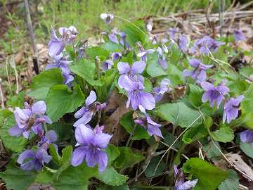 ![]() 花は大きめで横寸20oほど、葉はハート形。 菫色は青紫色ですが、白や黄色の菫も多いです。 |