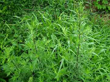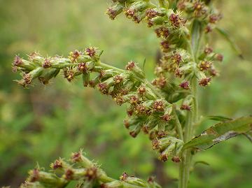 ![]() 直径は1.5〜2.0o、長さは4o前後の小さな赤褐色の花です。ブタクサ、カナムグラと共に、秋の花粉症の原因になります。 |