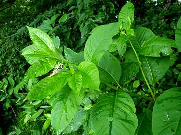 空地や道ばたでふつうに見られる大型の多年草。茎は太く、直立あるいは斜上し、高さは2mぐらいまでなります。 葉は先がとがった長楕円形で、長さは10〜30p。葉腋から垂れ下がる総状花序をだし、小さい花を多数つけます。 花は花弁がなく、5枚の白い花弁に見えるのがガク片で、大きさは直径5〜7oです。果実は緑色、熟すと黒紫になります。 名前の由来は、洋種はヨーロッパ・北アメリカ原産の植物、根が山牛蒡に似ているのでヤマゴボウ。 根はゴボウ、果実はブルーベリーに見えますが有毒植物、食べると腹痛・ 嘔吐・下痢、けいれんを起こして死亡することもあるそうです。 |