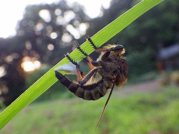 ![]() コガネムシを捕えた♂のシオヤアブ。毛深いです。 |