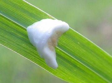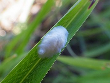 ![]() 完全な卵塊です。ほとんどがススキの葉に付いています。 ワタのような泡の中にはベージュ色の卵が詰まっています。 |