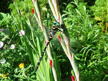 ![]() 体調が悪いのでしょうか、グラジオラスにぶら下がるように止まっています。 腹部先端の形状から、♂のようです。 |