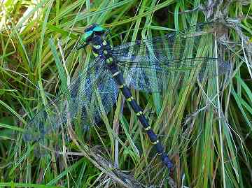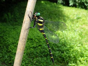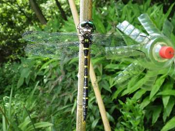 ![]() 珍しく支柱に止まったオニヤンマ♂。 体長約90o、♀より少し小さいです。 |