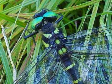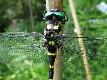 ![]() 顔アップ。人がかぶり物をしているようにも見えます。 他のトンボより複雑な色、形ですが怖くはないです。 |