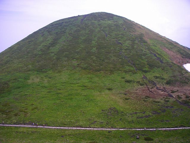 秋田駒の最高峰、女目岳(一等三角点1,637m)。男岳の途中から撮影、木道を歩く人が見える。