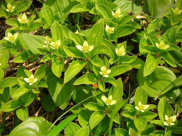 高さ15cm前後、葉は輪生状。4枚の白い花弁に見えるものは総苞片。