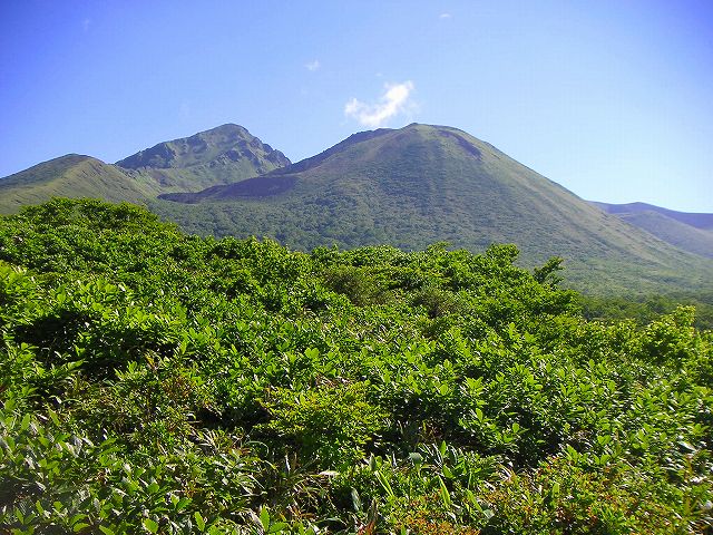 紫外線が気になる快晴。金十郎長嶺からの男岳とデンと構える女岳。カルデラの様子が手に取るよう。