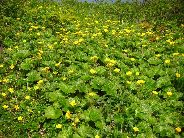 ミヤマダイコンソウは丸い大きな葉に黄色の花。イチゴに似た葉に黄色の花はミヤマキンバイ。