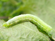 モンシロチョウに似ますが、側面に白線が入るので区別できます。体長は終齢幼虫で30mmぐらい。成虫の♂は黄色ですが、♀はモンシロチョウに似ています。数はモンシロチョウより少なく、エダマメが好きです。 |
