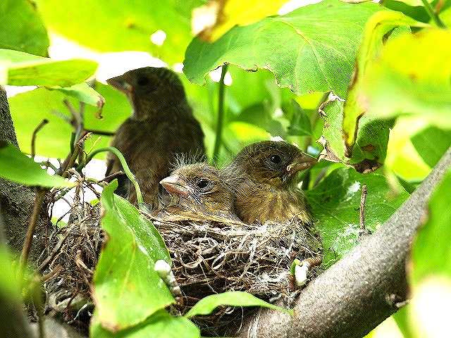 よく見ると、庭木に巣がありました。巣立ちまであとわずかです
