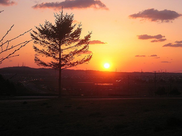 左の高みは、テレビ塔がある大森山公園。太陽は新屋地区の高台に沈みます。