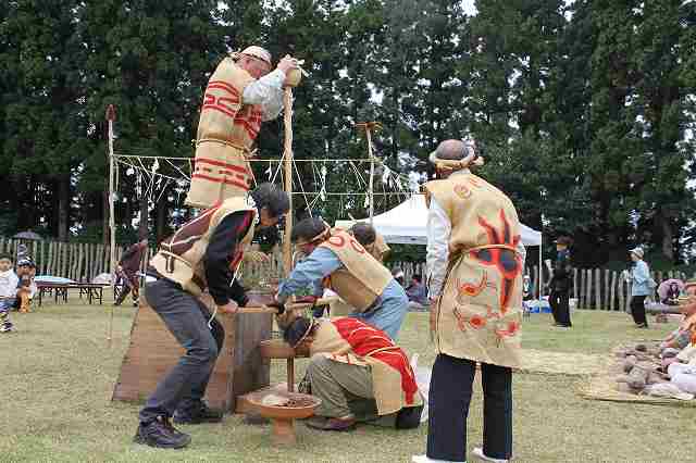 大きなマイギリによる火起しの始まりです。軸棒を回転させ、摩擦熱で火を点けます。