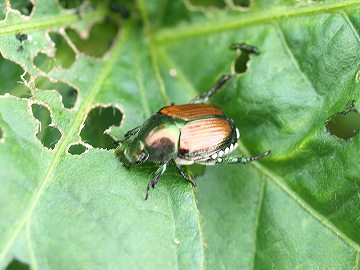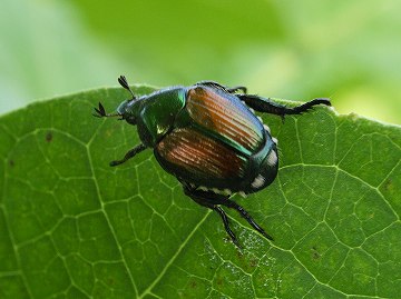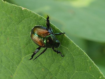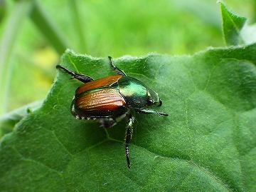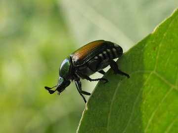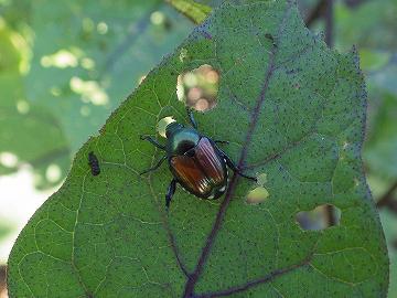 | マメコガネ (豆黄金虫) Popillia japonica 分類:昆虫綱・甲虫目・コガネムシ科 食草(成虫):マメ科植物、ナス、長芋など 害虫度:低★ |