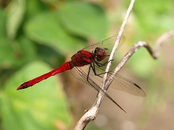 アキアカネに似ている赤とんぼ。体長は約4cm。 オスは秋に向かってだんだん赤くなります。トンボ類は、小さな虫を食べてくれる益虫です。 アキアカネとの識別は、翅胸の中の黒条で判断できます。 ナツアカネは黒条上部が断ち切れ、アキアカネは黒条上部が鋭角になっています。 |